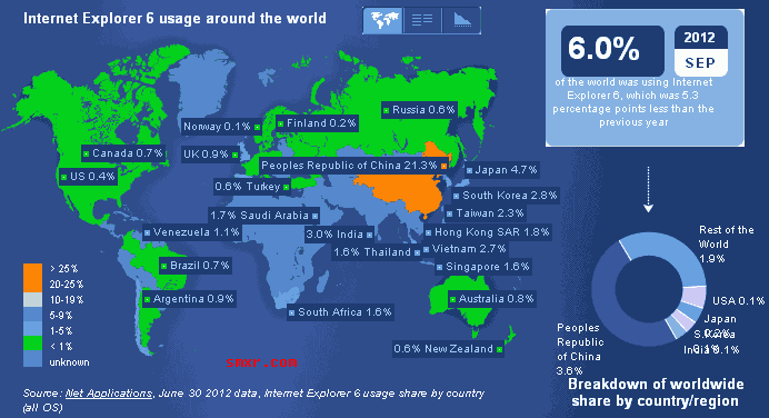 IE6风风雨雨走过了不少年头,修修补补后在国内仍然占据了非常大的市场份额。从全球的数据来看IE6仅占据了6%。而在中国,使用ie6的用户却缺占据了21.3%。